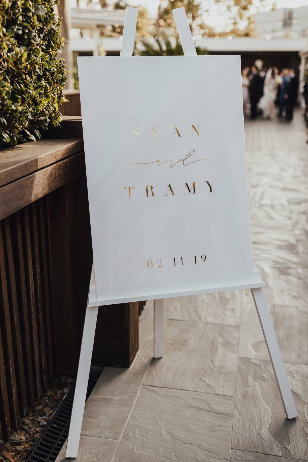 A white acrylic sign with gold font welcomed the guests to the marquee function space, and the ceremony took place within the venues built in grand 4 post ceremony arbour. With a white aisle leading to the grand arbour, the arbour was decorated with flowers and greenery in shades of white and ivory.
